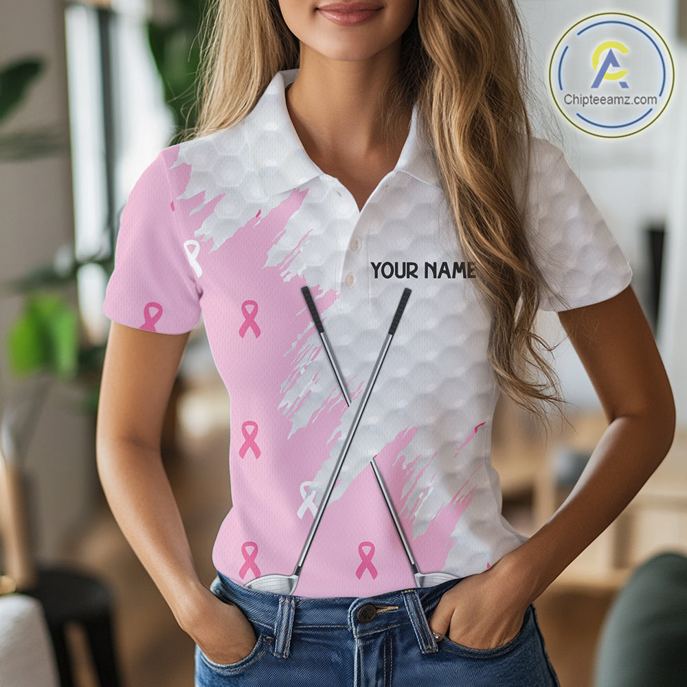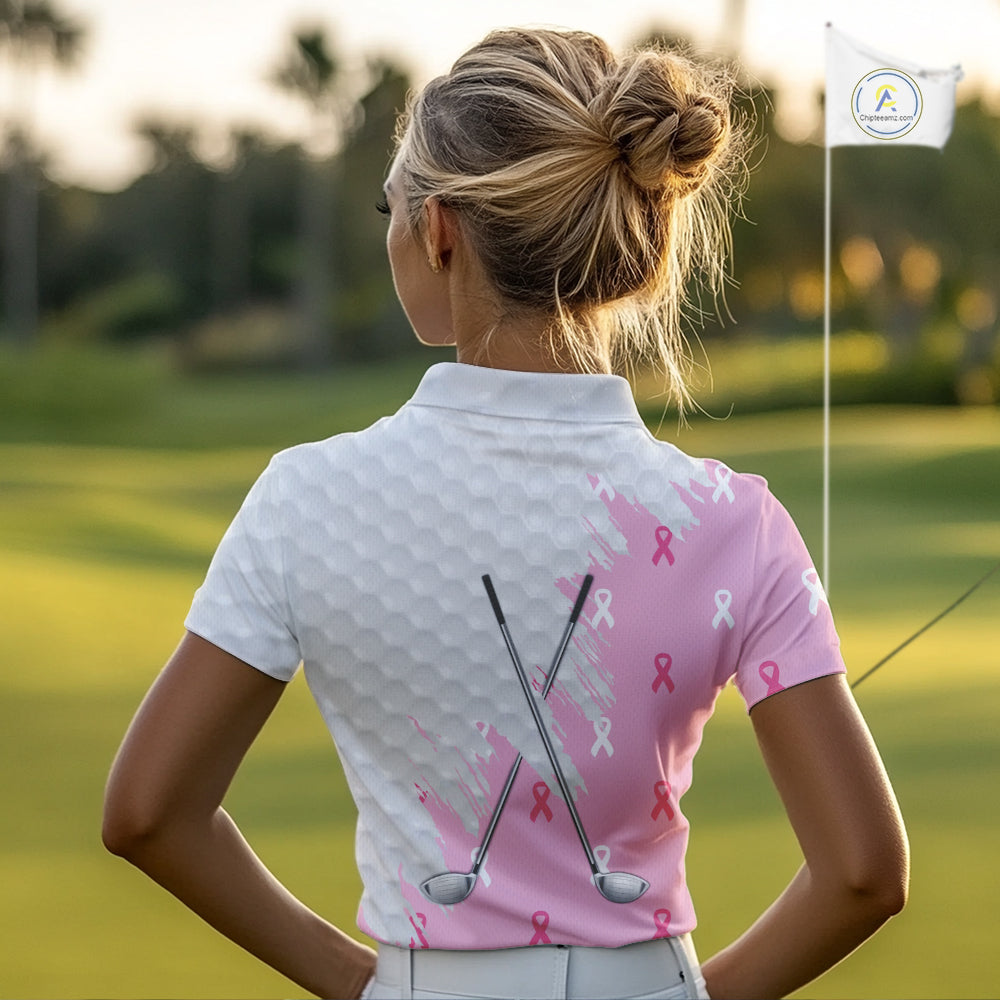 Light Pink ribbon breast cancer pattern custom white Women golf polo shirt, team ladies golf top NQS10422