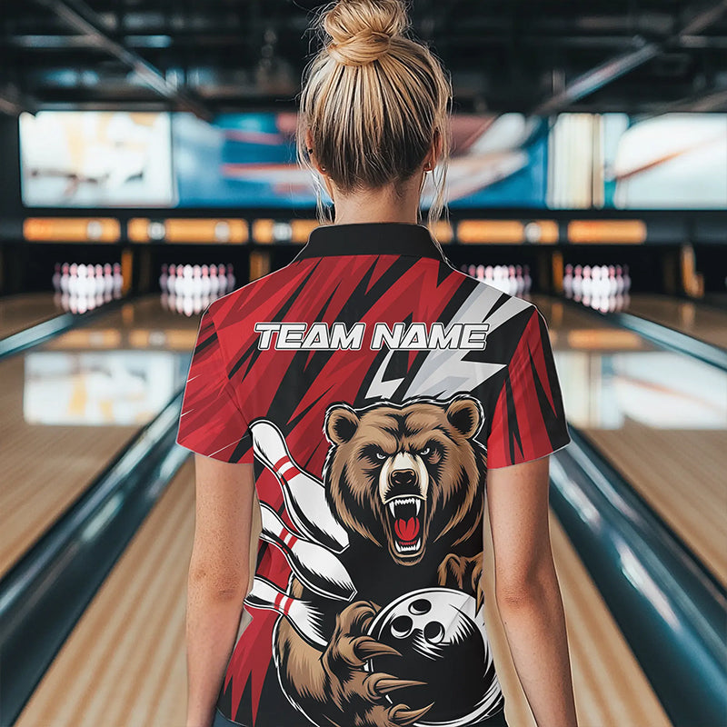 Personalized Bear Bowling Polo Shirts For Women, Bear Bowling Team Red Bowling League Shirt IPHW8827