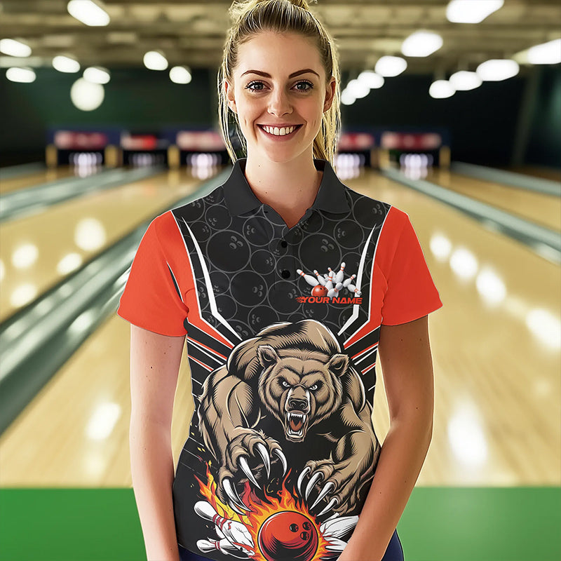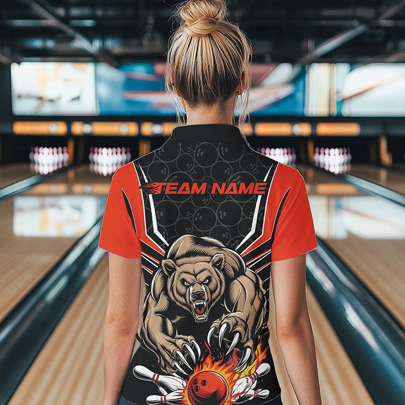 Black And Orange Custom Bear Bowling Jerseys, Bear Bowling Team Polo Shirts For Women IPHW8830