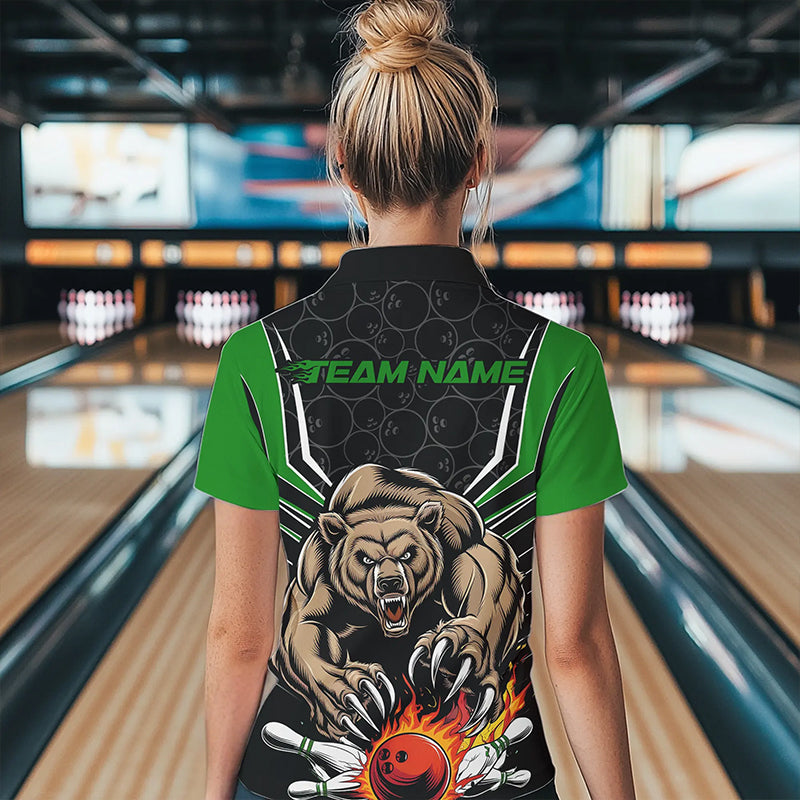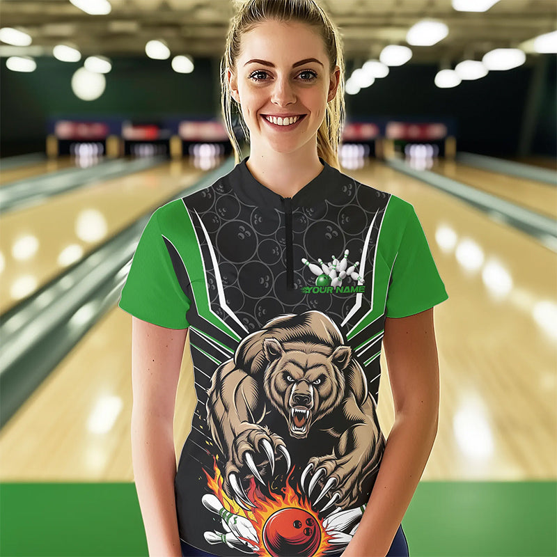Black And Green Custom Bear Bowling Jerseys, Bear Bowling Team Quarter-Zip Shirts For Women IPHW8832