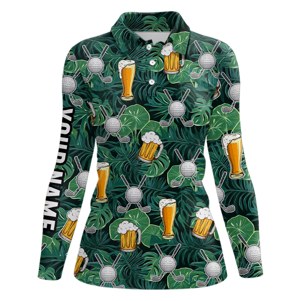 Green tropical leaves Golf beer pattern custom Womens golf polo shirt, golf tops for ladies NQS7472