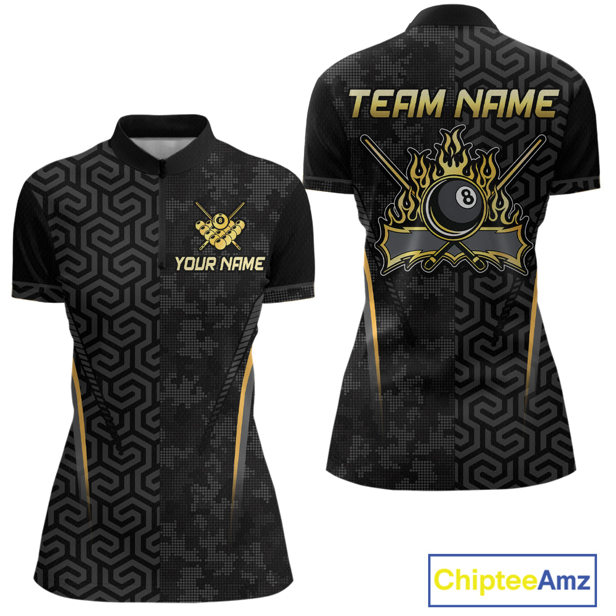 Custom Black Gold 8 Ball Flame Billiard Shirts for Women, Billiard Team Polo & 1/4 Zip Shirts NNT61