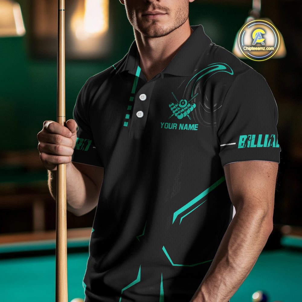 Custom 8 Ball Pool Crown Men Billiard Shirts, Turquoise And Black Billiard Team Shirt, Pool Jersey TDM4052