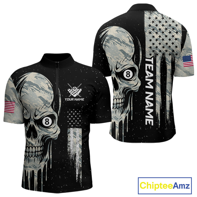 Grunge Camo Skull American Flag Billiard Shirt For Men Custom Patriotic 8 Ball Pool Team Jersey TDM4276