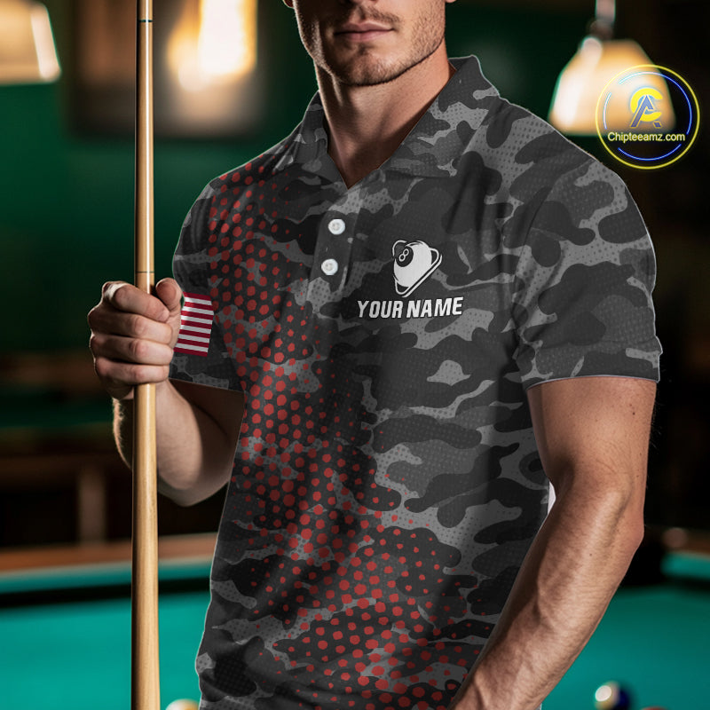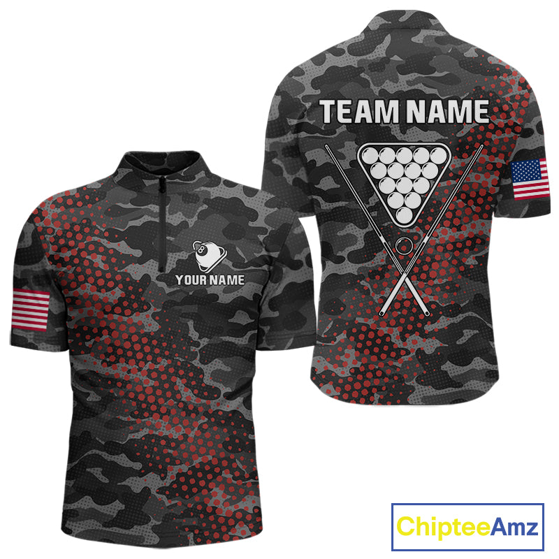 Personalized Red & Grey Camo Billiard Shirt For Men, 8 Ball Billiard Jersey Team Polo & 1/4 Zip TDM4431