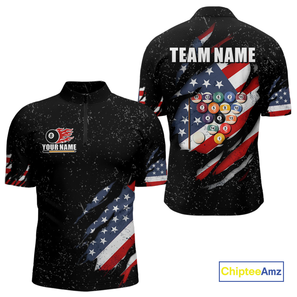 Personalized American Flag Black Grunge Billiard Shirt For Men, Patriotic 8 Ball Pool Team Jersey TDM4444