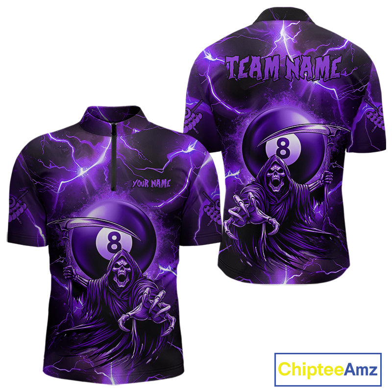 Purple Grim Reaper 8 Ball Men's Billiard Shirt Custom Thunder Lightning Halloween Pool Team Jersey TDM4874