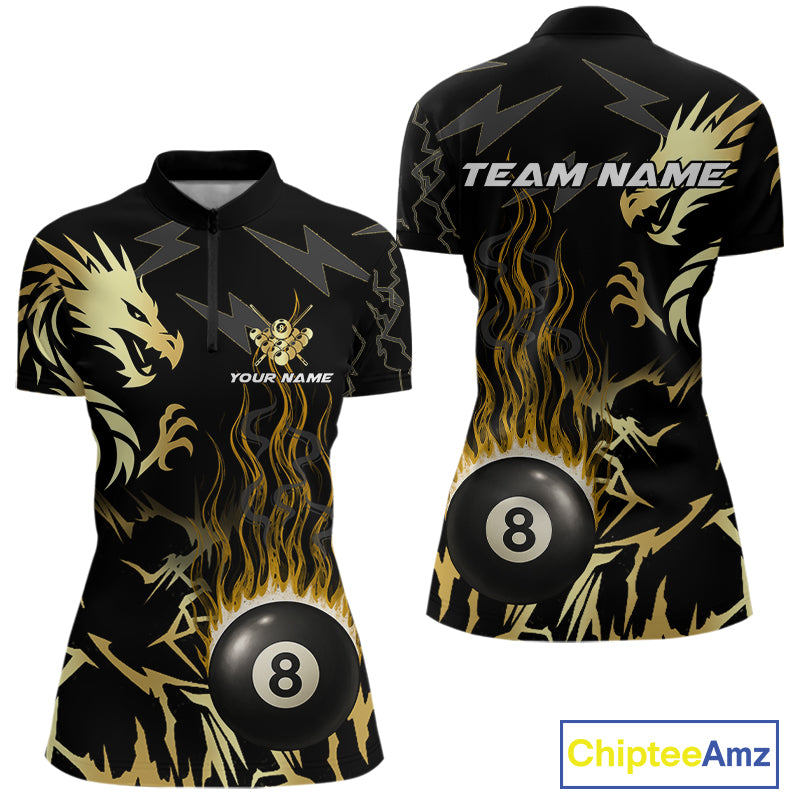 Black And Gold Flame 8 Ball Pool Shirt For Women Custom Dragon Billiards Team Jersey Polo & 1/4 Zip TDM4103