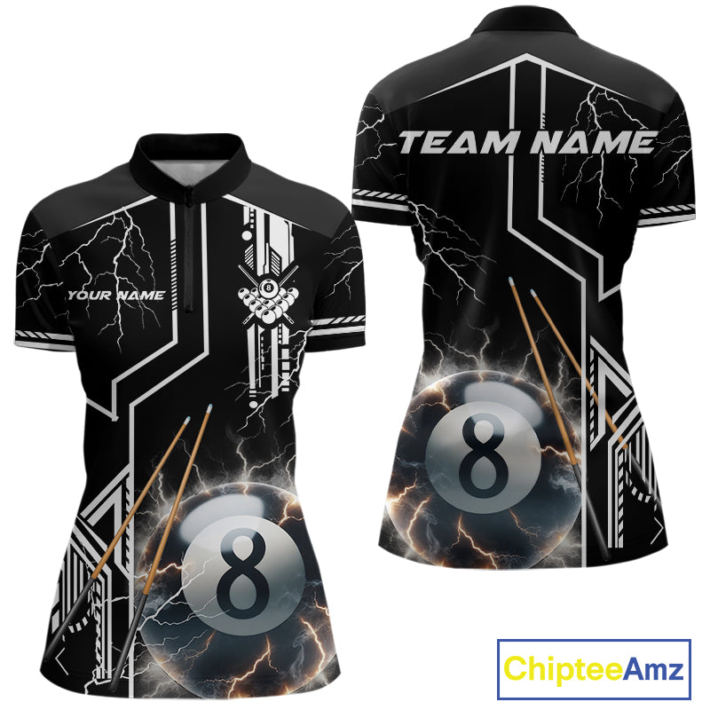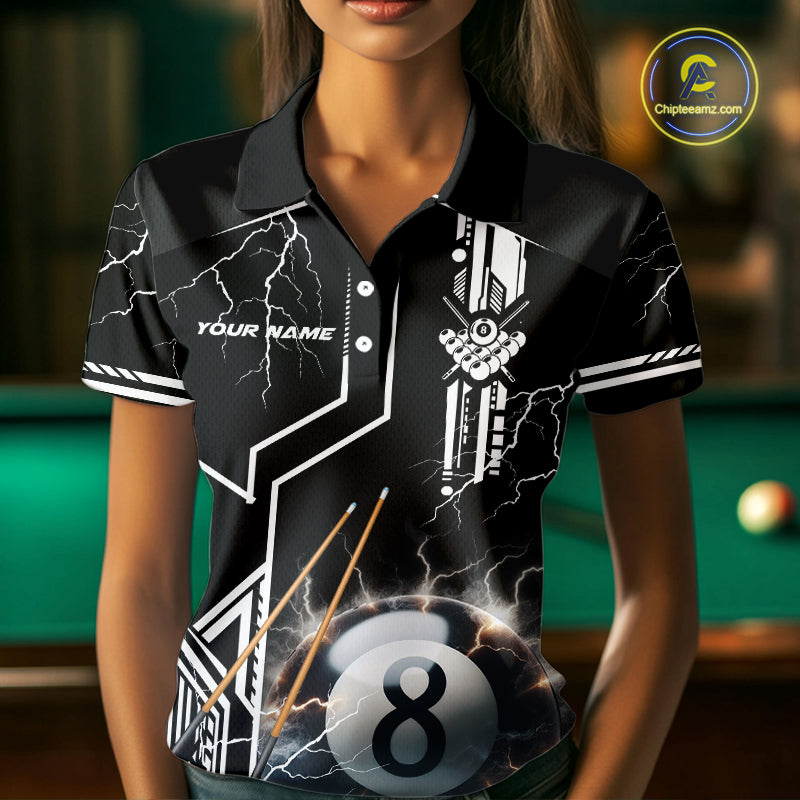 Personalized Thunder Lighting 8 Ball Shirt For Women, White Black Billiard Team Shirts, Pool Jerseys TDM4110