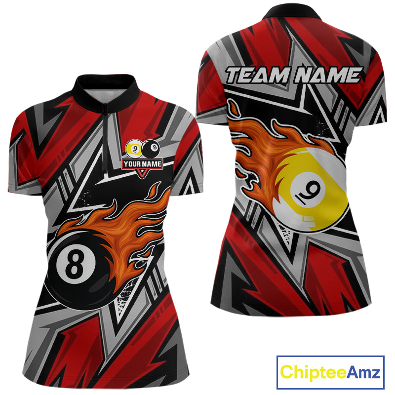 Personalized Women's Billiard Shirts, Flame 8&9 Ball Custom Red Zig-Zag Billiard Team Jerseys TDM4137