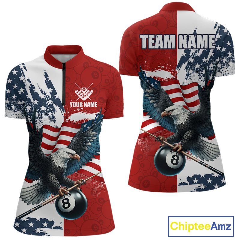 Personalized American Flag Eagle Women Billiard Shirt Custom Patriotic 8 Ball Pool Team Jersey |Red TDM4370