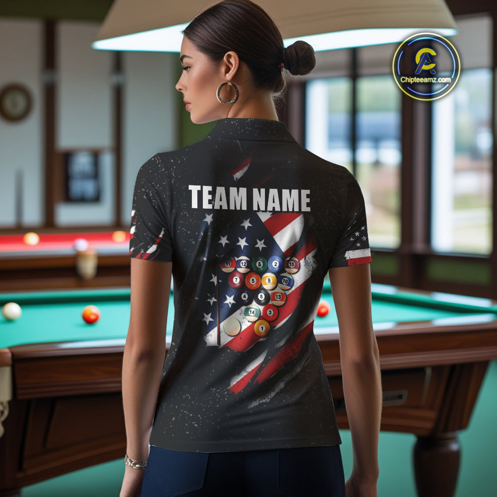 Personalized American Flag Black Grunge Billiard Shirt For Women, Patriotic 8 Ball Pool Team Jersey TDM4444