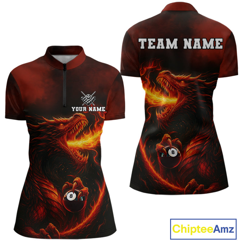 Personalized Flame Dragon 8 Ball Billiard Shirt For Women Custom Red Pool Team Jersey Polo, 1/4 Zip TDM4445