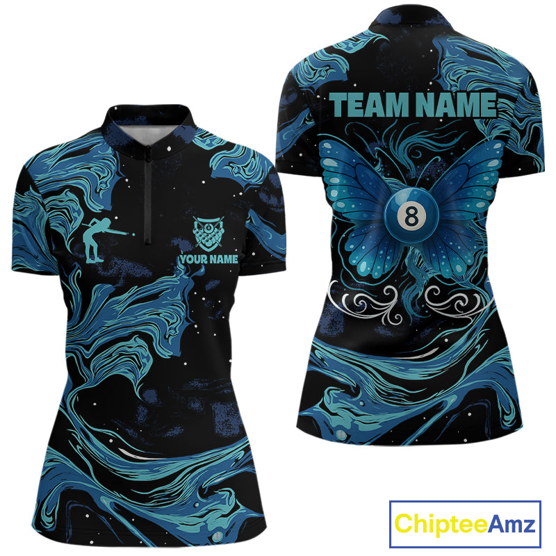 Custom Teal Blue Marble Billiard Shirt For Women, 8 Ball Butterfly Pool Team Jersey Polo & 1/4 Zip TDM4776