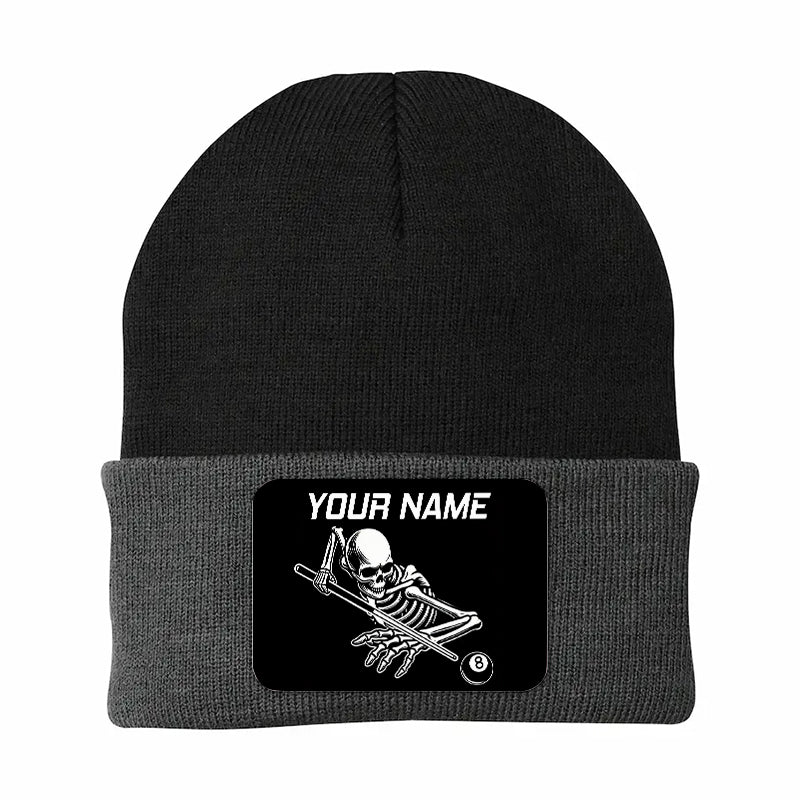 Personalized Skull 8 Ball Billiard Knit Beanie Hat With Rectangle Patch Custom Billiard Knit Cap TDM4940