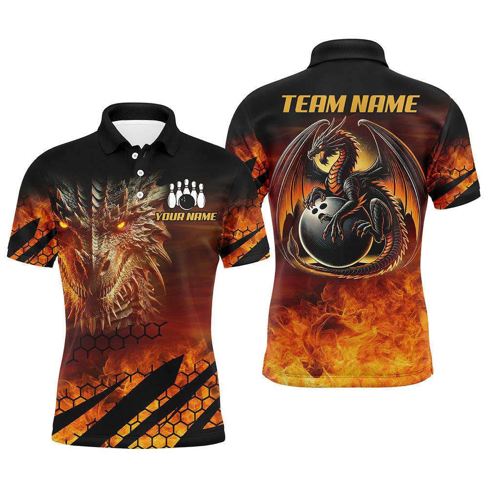 Black And Orange Custom Dragon Flame Bowling Shirts For Men, Dragon Fire Bowling Team Shirts NQS8234