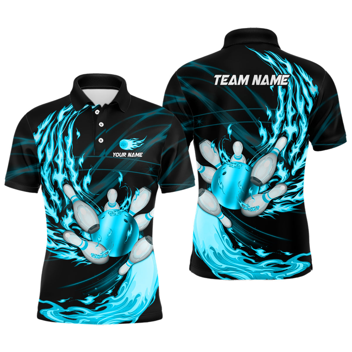 Black Mens bowling shirts Custom Cyan Blue flame Bowling ball and pins Team league bowler Jerseys NQS8486