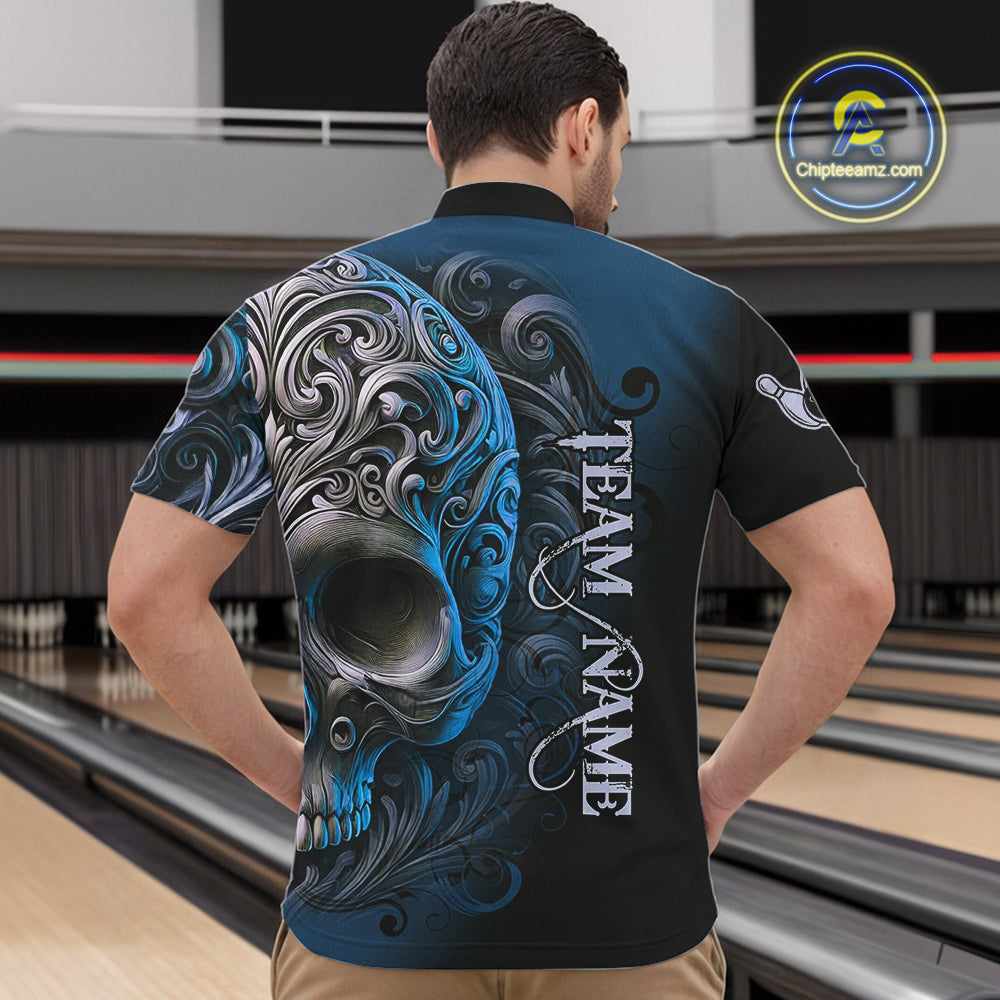 Blue and Black Skull Scroll Men Bowling Polo, Quarter Zip Shirts Custom Skull Team bowling Jersey NQS10939
