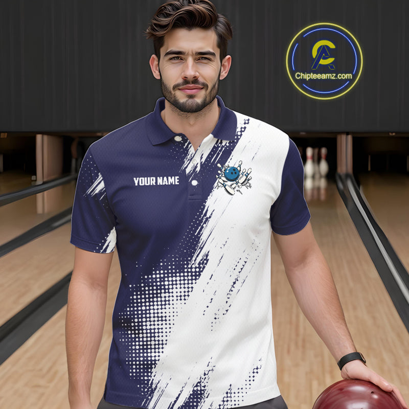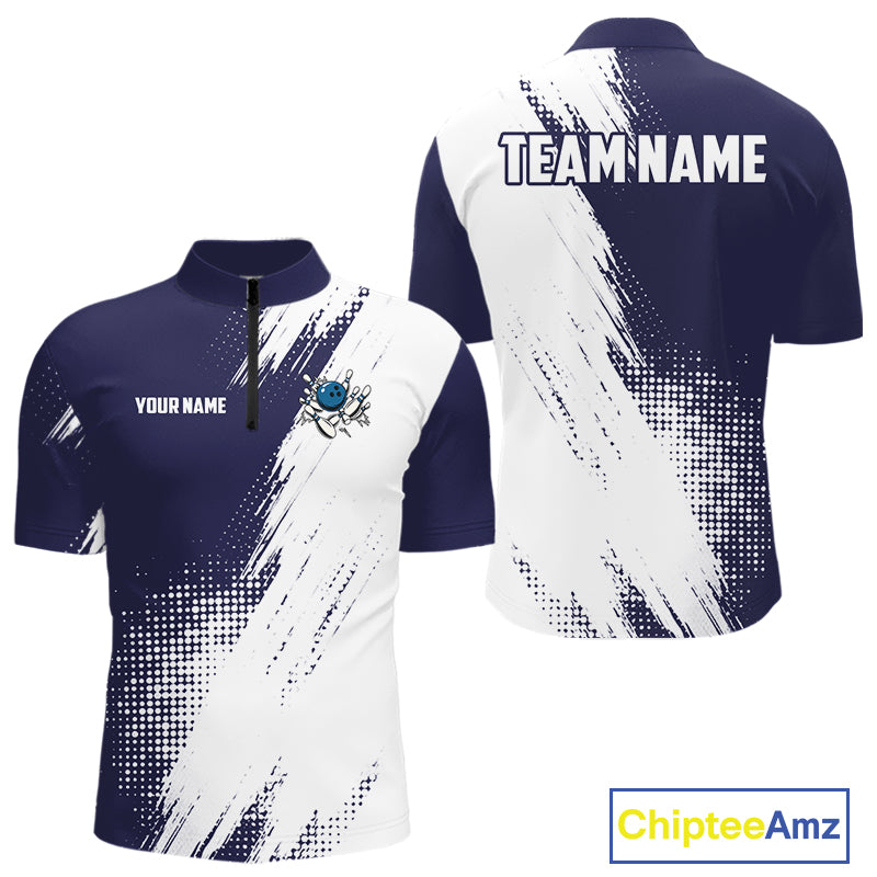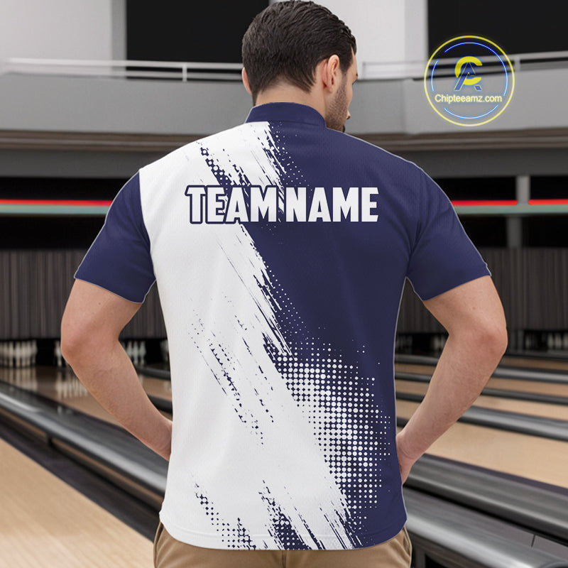 Custom Blue and White Strike Bowling Shirts Men Polo, Quarter Zip Bowling Team Jerseys Bowling League NQS10826
