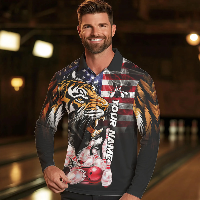 Smoke American Flag Tiger Bowling Polo, 1/4 Zip Shirts for Men Custom patriotic Team Bowling jerseys NQS9672