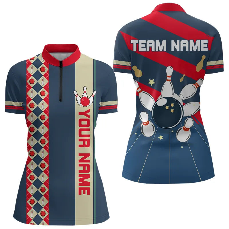 Personalized Red, white and blue Retro bowling Polo, Quarter Zip shirt for women, Bowling Team Jersey NQS9461