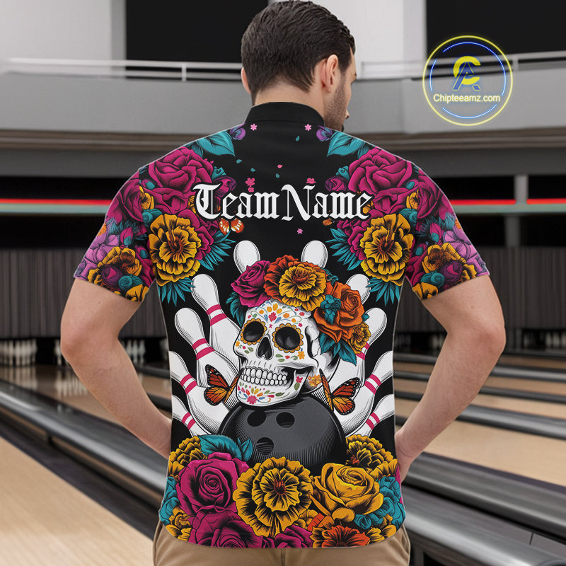 Custom Flower Sugar Skull Bowling Team Quarter-Zip Shirts For Men, Halloween Bowler Outfit IPHW9749