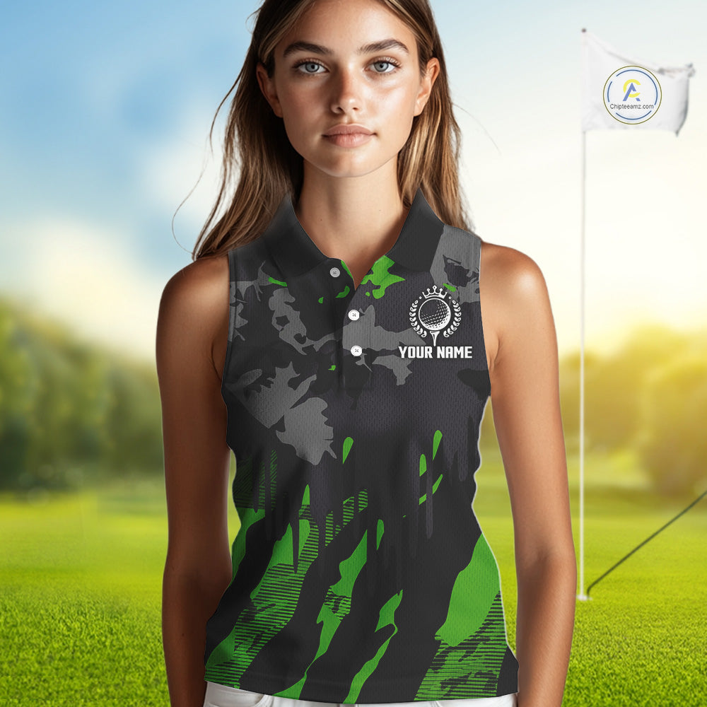 Black and Green Camo pattern Womens Sleeveless Polo Shirts custom ladies golf tops, cool golf gifts NQS9827