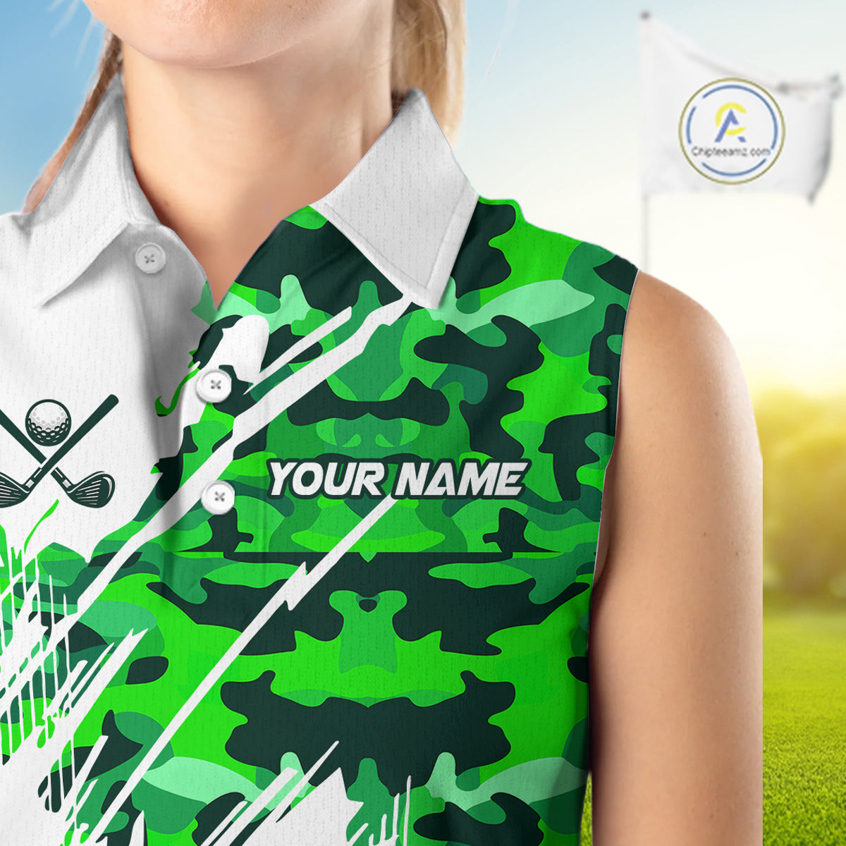 Personalized Women sleeveless golf polo shirt custom white and green camo ladies golf apparel NQS10334