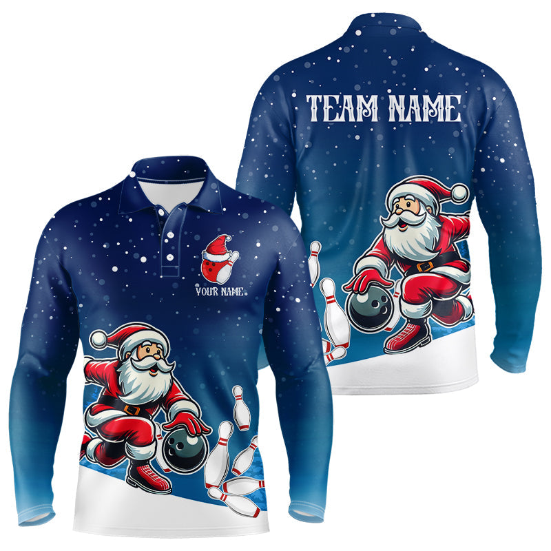 Christmas Santa Bowling Polo, Quarter Zip Shirts For Men Custom Christmas Bowling Team Jerseys | Blue NQS9054