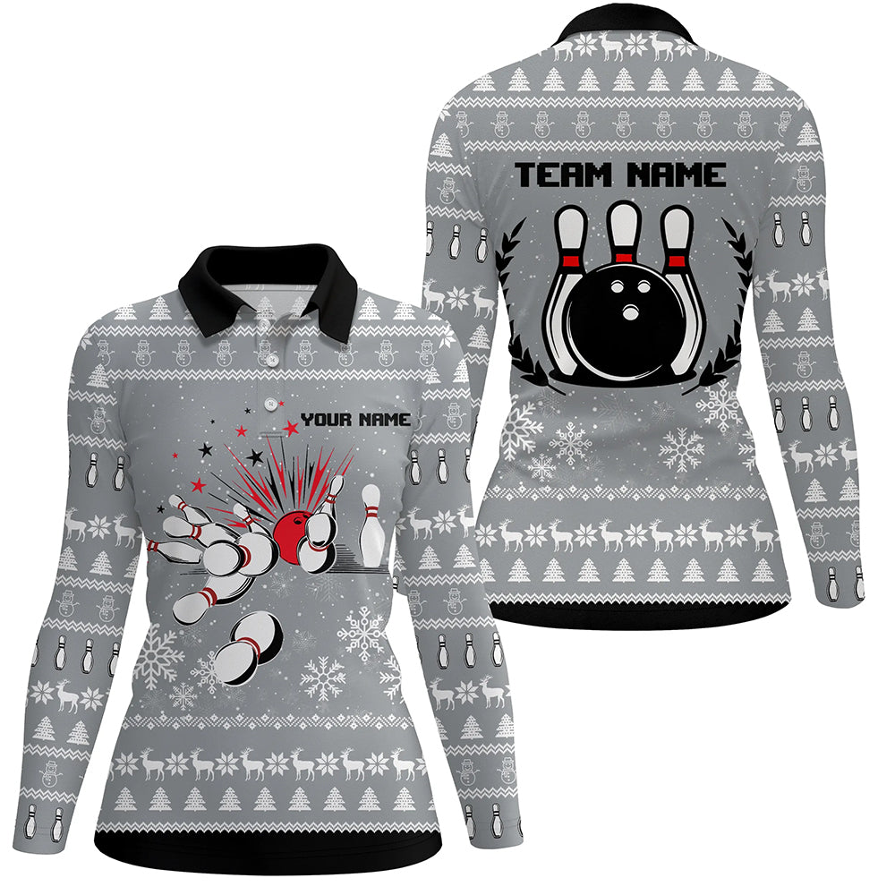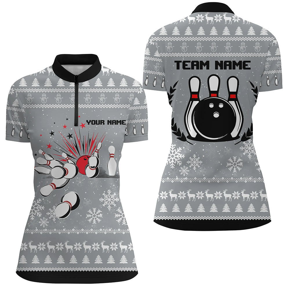 Grey Ugly Christmas pattern Women Bowling Polo, Quarter zip shirts Custom Xmas Team Bowling Jersey NQS8973