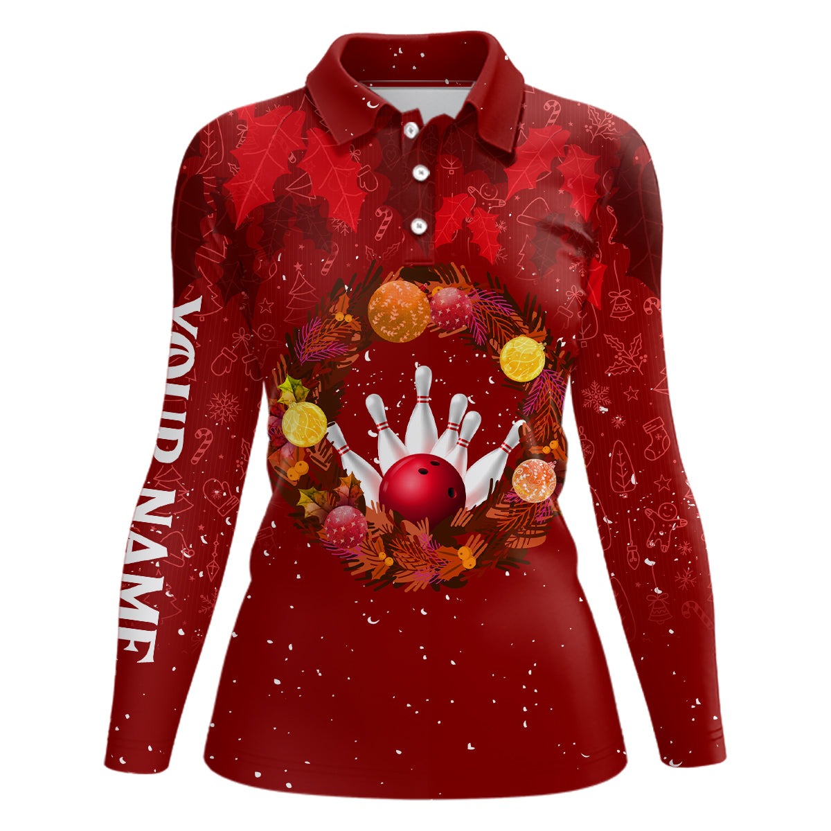 Red Christmas Wreath Women's Bowling Polo, Quarter-Zip Shirt Custom Christmas bowling tops for Team NQS8960