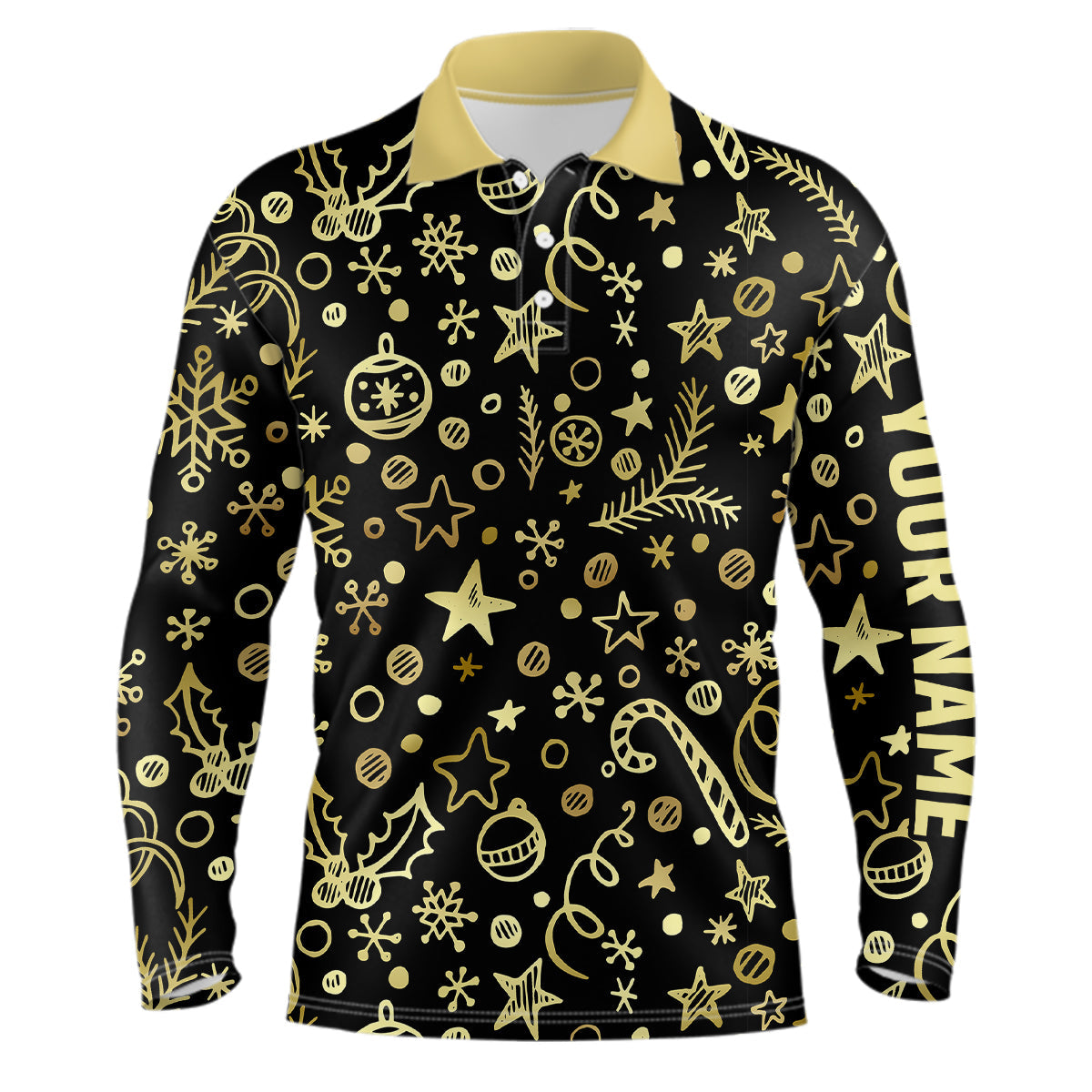 Mens golf polo shirts custom golden Christmas black pattern shirt for ladies, personalized golf gifts NQS6586