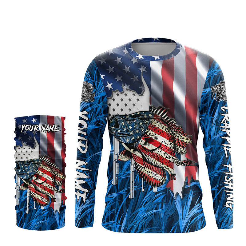 American flag patriot Crappie blue camo fishing, custom mens long sleeve sun protection fishing shirts NQS7987