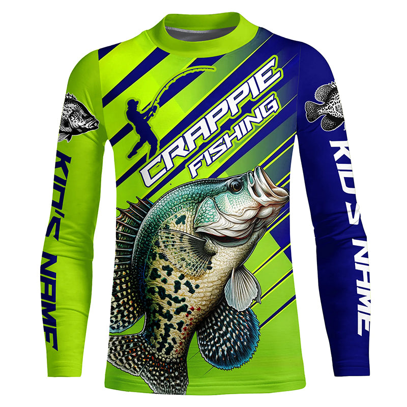Crappie Fishing Custom Long Sleeve Tournament Shirts, Green And Blue Crappie Fishing Jerseys IPHW6280