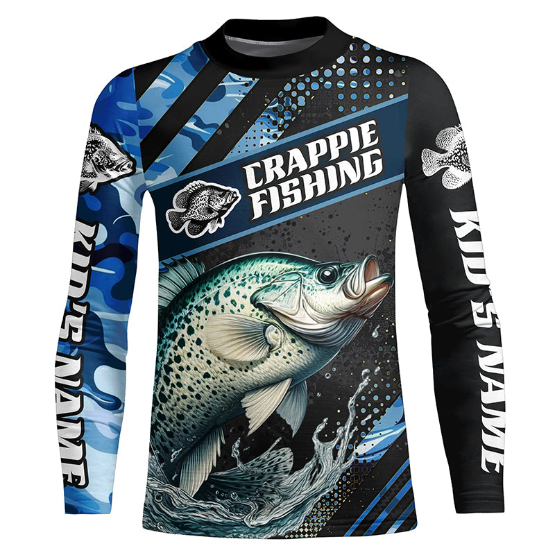Personalized Blue Camo Crappie Fishing Jerseys, Crappie Long Sleeve Tournament Fishing Shirts IPHW6331