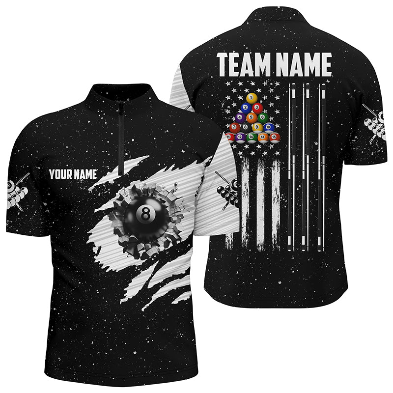 Customized Black White Grunge American Flag 8 Ball Pool Men Billiard Shirts, Patriotic Pool Jerseys TDM2985