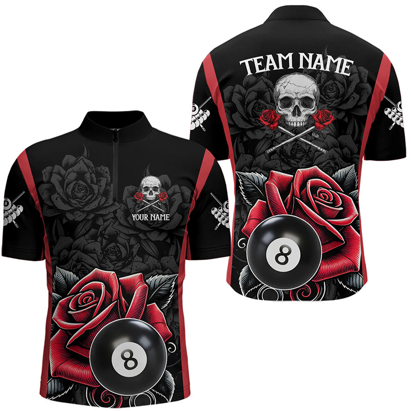 Black And Red 8 Ball Pool And Roses Custom Skull Billiard Shirts For Men, Unique Billiard Jerseys TDM3204