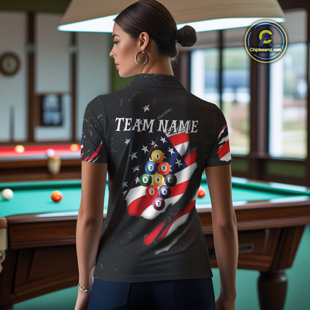 Personalized Patriotic 9 Ball Billiard Shirt For Women Custom Black Grunge American Flag Pool Jersey TDM4758