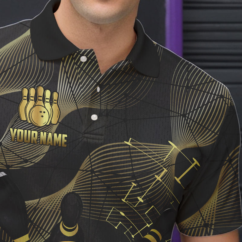 Personalized Black and Gold Bowling Polo, Quarter Zip Shirts For Men Custom Bowling Team League Jersey NQS9688