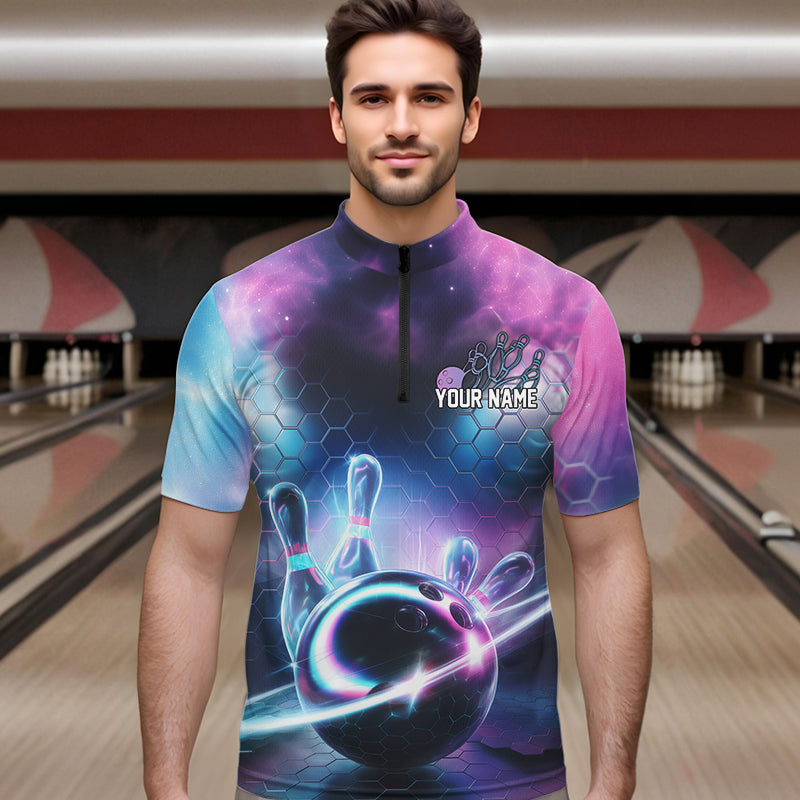 Custom Galaxy Bowling Team Men Quarter-Zip Shirts, Holographic Bowling Jersey Bowling League Shirt IPHW8904