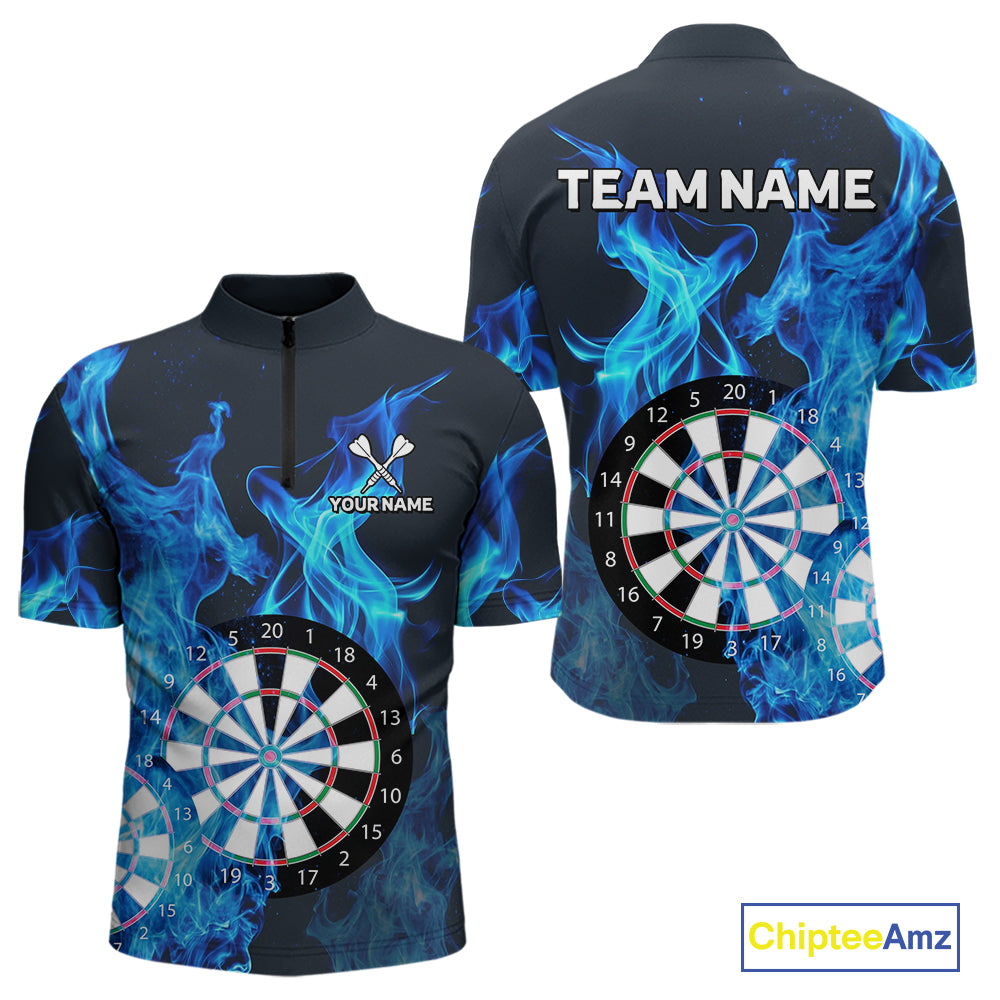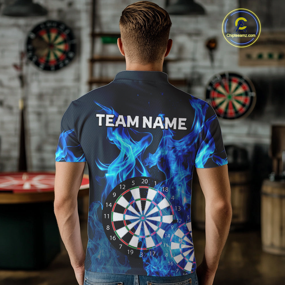 Blue Flaming Dartboard Darts Polo & Quarter Zip Custom Dart Shirts For Men Team Dart Jerseys TDM3821
