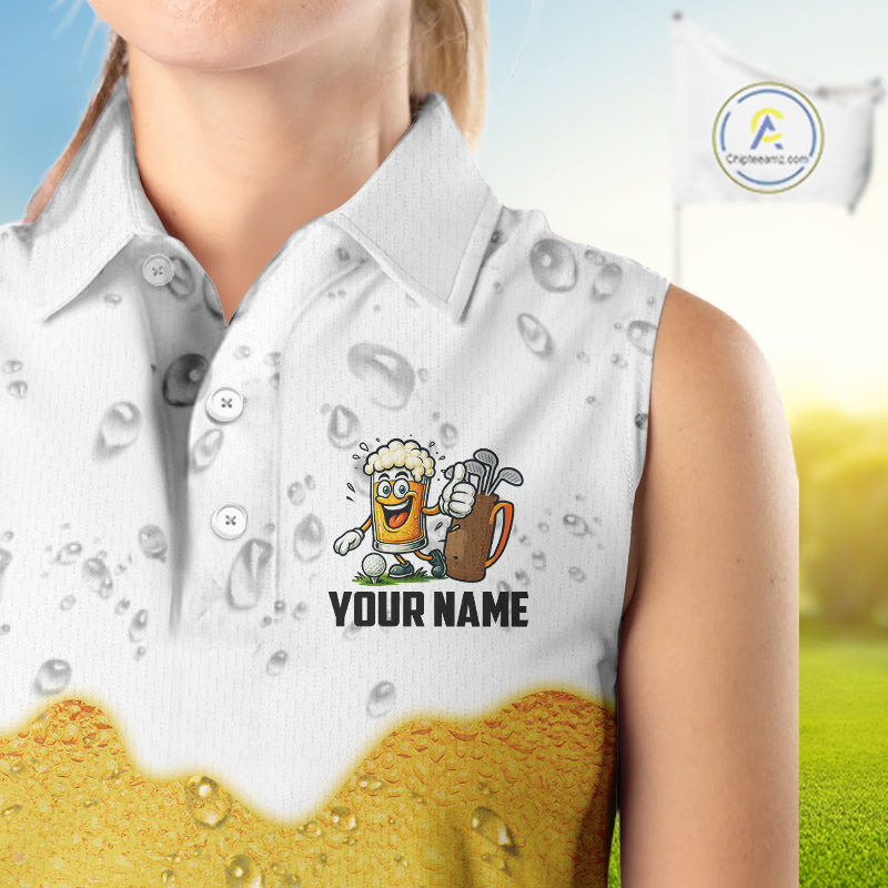Custom White And Yellow Funny Beer Women Sleeveless Polo Shirt, Funny Beer Glass Ladies Golf Outfit NQS10919