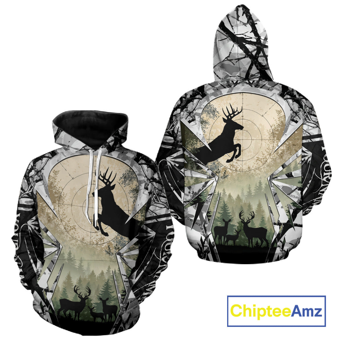 Grey Camo Deer Hunting Hoodie, Buck with Scope Silhouette, Whitetail Season NBT14