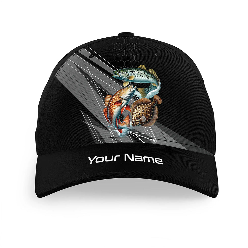 Personalized Black camo Redfish, Trout, Flounder Fishing baseball cap, Texas Slam fishing hats NQS10143