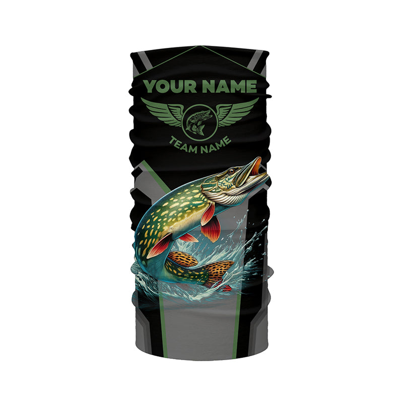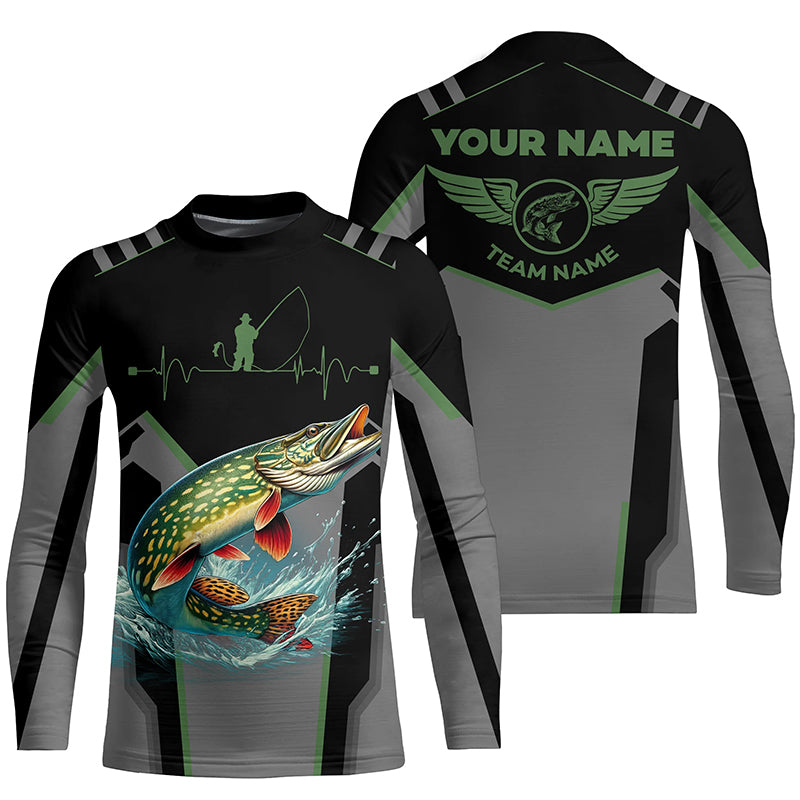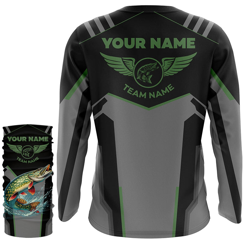 Personalized Black Northern Pike Fishing jersey, Team Pike Fishing Long Sleeve tournament shirt| Green NQS6318