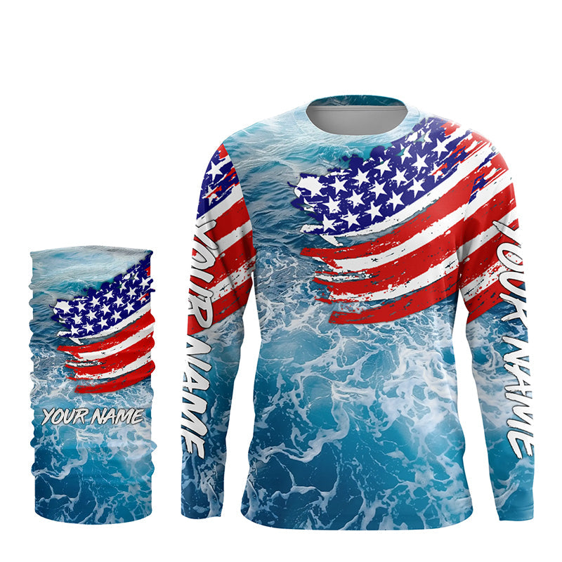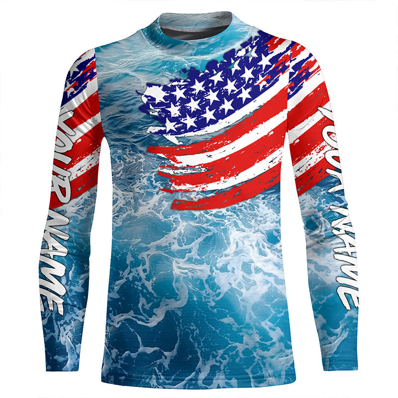 Blue ocean sea wave camo fishing American flag Custom patriot long sleeve fishing tournament shirts NQS7389