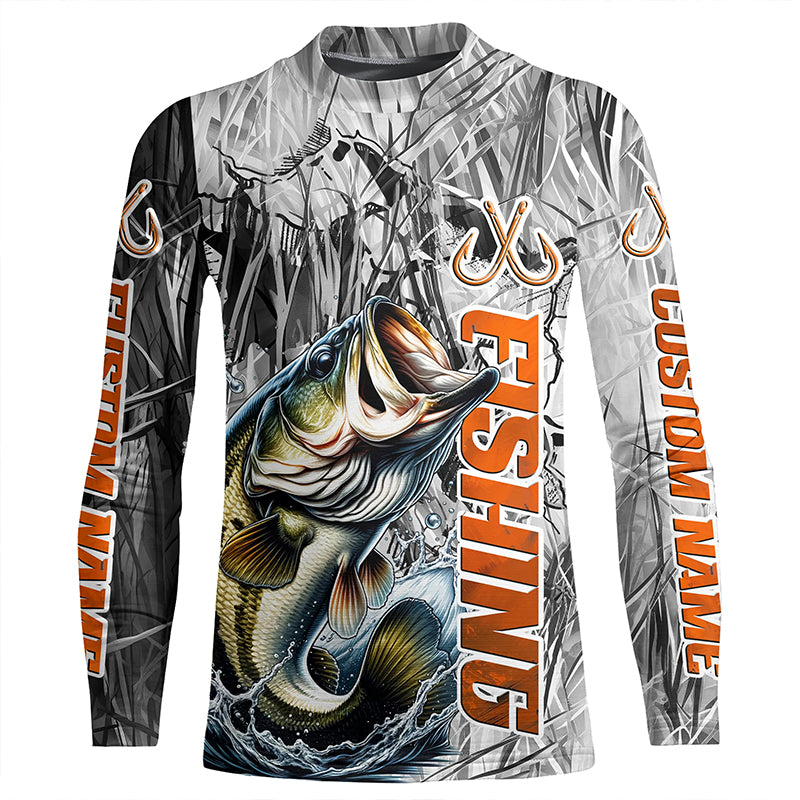 Largemouth Bass Fishing Custom Long Sleeve Tournament Fishing Shirts, Gray Camo Bass Fishing Jerseys IPHW6463