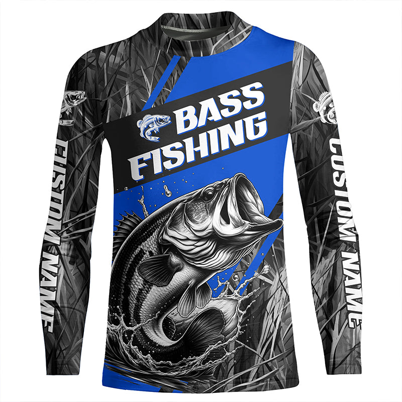 Black And Blue Camo Bass Long Sleeve Tournament Fishing Shirts, Custom Bass Fishing Jerseys IPHW6683