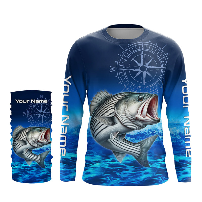 Personalized Striped bass Blue Long Sleeve Performance Fishing Shirt, compass striper tournament Shirt NQS5852