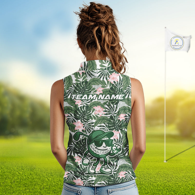 Green tropical leaf pattern pink flower funny Sleeveless Golf polo shirts Custom ladies golf outfits NQS10023